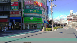 駐輪場を抜けると十字路が見えてきますので、「レイクALSA」や「BIG ECHO」の建物を直進します。