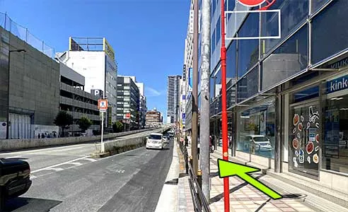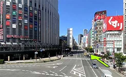 (1)ヨドバシカメラを左手に見て、右側の歩道を中津方面へ直進してください。
