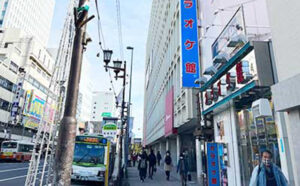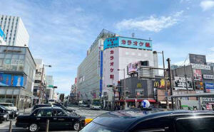 「マクドナルド」を過ぎ「カラオケ館」を過ぎると「高島屋」が見えてきます。横断歩道が見えるまでそのままさらに真っ直ぐ進みます。